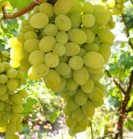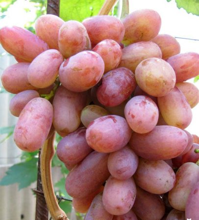 분홍색 열매는 350~400g의 튼튼한 송이를 이룹니다. 씨가 없거나 작은 뿌리만 있습니다. 110일 만에 익기 때문에 여름이 짧은 지역에 적합합니다.