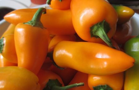 "폭스" 고추 씨앗을 샀는데, 포장에 있는 사진이 마음에 들었어요. 그 식물은 작게 자라서 5월에 온실에 심었어요. 7월 말에 첫 열매가 맺혔고, 금세 녹색에서 주황색으로 변하기 시작했어요. 그 식물은 즙이 많고 매콤한 열매를 열 개 정도 맺었어요.