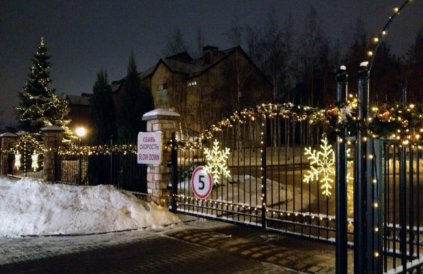 현관과 안뜰은 아름답게 장식되어 있습니다. 야외용 LED 조명으로 대문과 입구를 장식합니다. 대문에서 현관문이 보이면 전나무 가지와 화사한 화환으로 장식할 수 있습니다. 화환은 새해를 상징하는 쥐 모양으로 매달립니다.