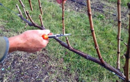 4월 초순에 덮개를 제거하고 덩굴을 묶어 꼭대기가 서로 다른 방향을 향하도록 합니다. 가운데 싹은 꼭 제거하고 아래쪽 싹 두 개는 남겨둡니다. 여름이 되면 2개의 새싹이 자랄 것입니다.가을에는 밑부분에 싹 몇 개만 남겨 두세요. 나머지는 모두 잘라내세요. 겨울을 대비해 단열 처리해 주세요.