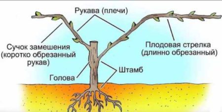가지치기 후에도 한 쌍의 눈(짧은 가지)이 남아 있는 덩굴을 대체 가지라고 합니다. 이 가지는 열매를 맺은 꽃줄기 아래에서 자랍니다. 이 가지에서 자라는 새순은 가을에 열매를 맺는 연결 고리 역할을 합니다. 가지는 열매를 맺은 꽃줄기와 대체 가지로 구성됩니다.