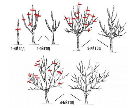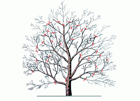 먼저 나무를 주의 깊게 살펴보고 겨울 동안 손상된 가지가 있는지 확인하세요. 이 가지들은 건강한 가지와 달리 새싹이 잘 나지 않습니다. 여러 개의 주요(골격) 가지와 추가적인 가지가 있는 관목 형태의 수관형 가지를 선택하는 것이 가장 좋습니다. 이러한 선택은 나무의 안정성을 높이고 과일 무게로 인한 변형을 방지하기 때문에 중요합니다. 또 다른 중요한 고려 사항은 익은 과일을 수확하기 쉬운지 여부입니다.