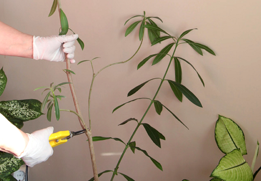 가지치기는 일 년에 여러 번 하는데, 휴면기가 끝나는 3~4월과 활발한 생장기가 끝난 가을에 실시합니다. 독성 수액이 피부나 눈에 닿지 않도록 장갑과 보안경을 착용하십시오. 가지치기에는 날카로운 칼이나 전정 가위가 필요합니다.
