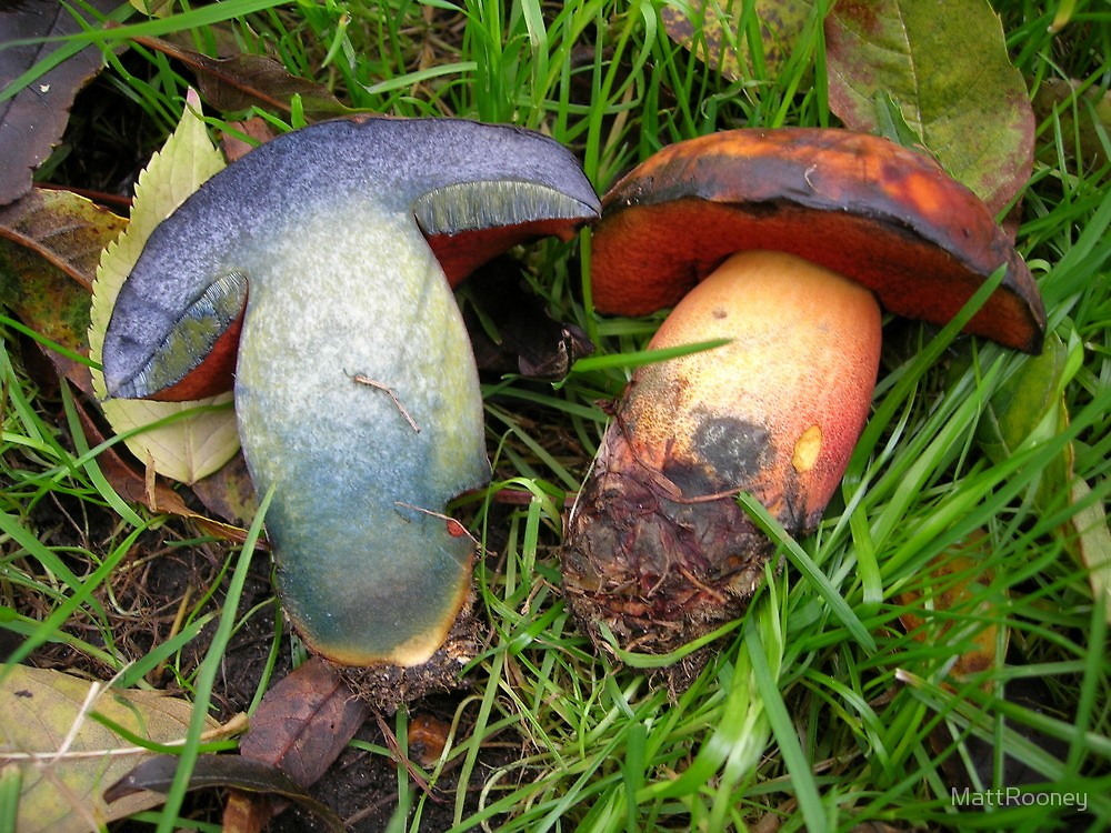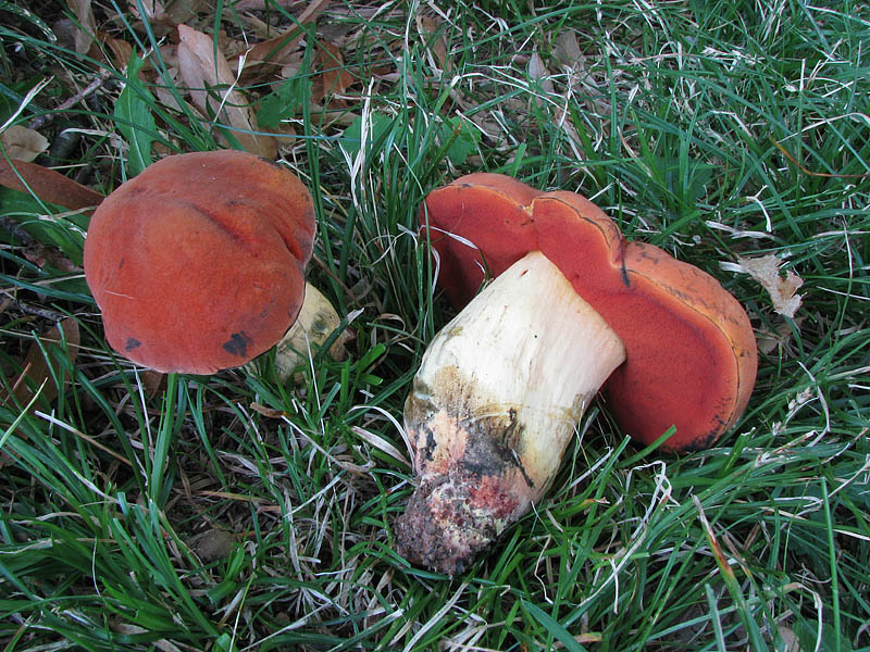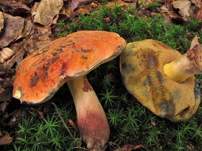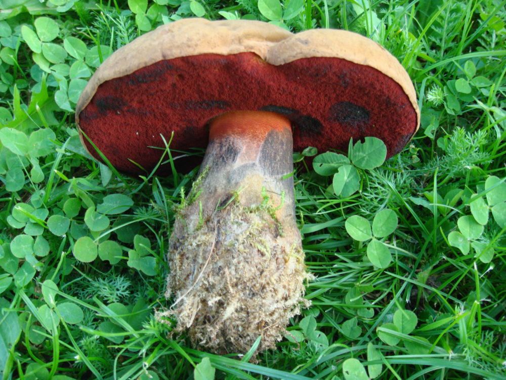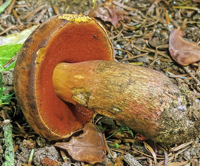 이 종은 멍이버섯 또는 푸른버섯으로도 알려져 있습니다. 이전 종보다 크기가 작다는 점이 다릅니다. 갓은 갈색이고 질감이 부드러우며, 누르면 어두워지는 특징이 있습니다. 관 모양의 부분은 빨간색이고 가장자리는 노르스름한 색조를 띱니다. 누르면 즉시 파란색으로 변합니다.