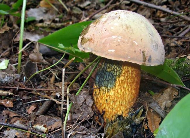 - 줄기 자체는 크림색이고 색상이 균일하며, 망사나 결이 없고, 원통형이며, 자르면 즉시 파란색으로 변하지만 그다지 눈에 띄지는 않습니다.