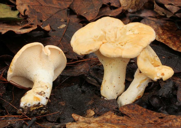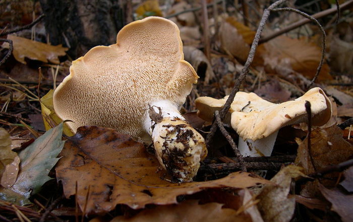 살구버섯과에 속하는 이 버섯은 다육질이고 매끈하며 납작한 깔때기 모양의 갓을 가지고 있으며, 길이는 12cm에 달합니다. 갓의 색깔은 지역에 따라 미색에서 밝은 주황색까지 다양합니다. 갓은 편평하고 가운데가 오목합니다.