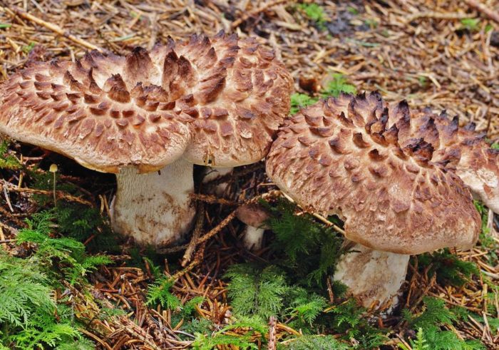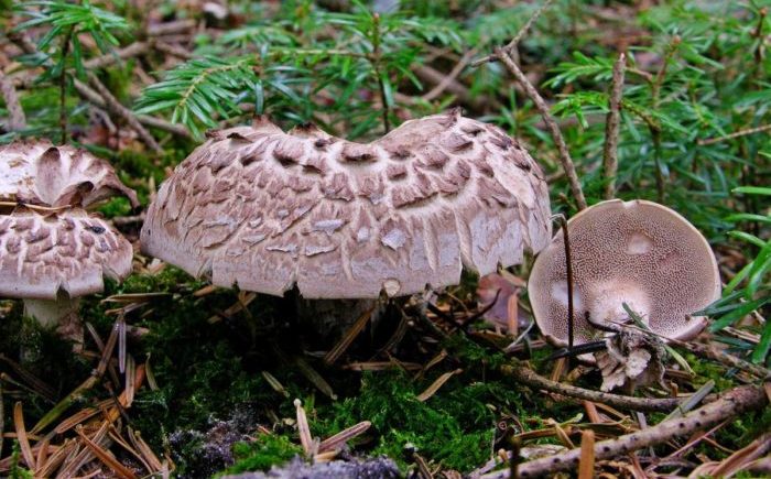 Bankeraceae과의 Sarcodon 속에 속하며, 매, 닭, 콜차크라는 일반적인 이름을 가지고 있으며, 볼록하고 타일과 같은 비늘이 있는 큰(직경 최대 20cm) 갓의 밝은 갈색 때문에 얼룩덜룩하다고 불립니다.