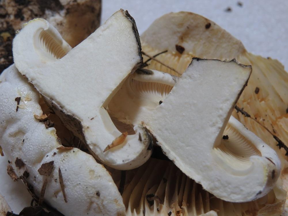 - 삐걱거리는 버섯의 살은 매우 조밀하지만 부서지기 쉽고 흰색입니다. 은은한 향이 나며 누르면 우유 같은 즙이 나옵니다. 뜯으면 살은 노란색을 띠고 즙은 붉은색으로 변합니다.