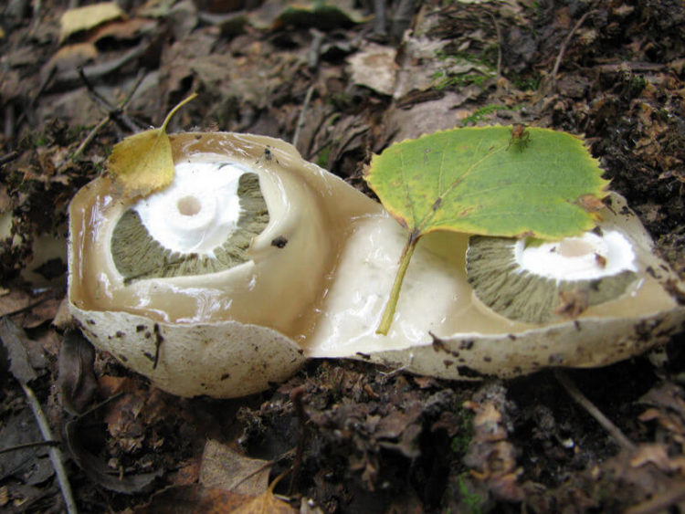 누렇게 변색된 껍질 아래에는 성숙한 버섯의 배아와 비슷한 자실체가 있습니다. 어느 시점이 되면 껍질이 갈라져 세 개의 꽃잎으로 갈라집니다. 그 후 버섯은 빠르게 자라기 시작하여 높이가 20cm에 이릅니다.