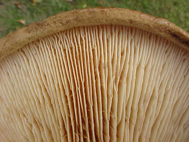 습도 변화에 따라 표면 구조가 변합니다. 매끄럽고 건조한 상태에서 촉촉하고 끈적거리는 상태로 변합니다. 내부는 층상이며 황색을 띱니다. 층상 판은 넓고 줄기 쪽으로 내려옵니다. 때로는 다리로 연결되어 세포를 형성하기도 합니다. 누르면 판이 짙은 갈색으로 변합니다.