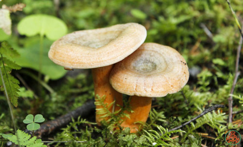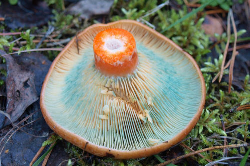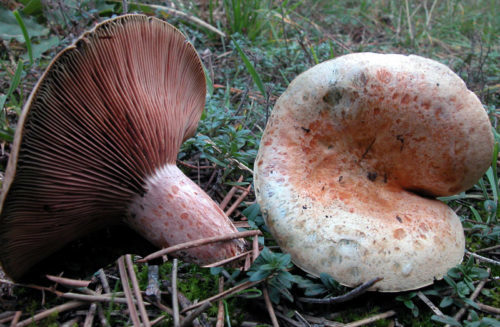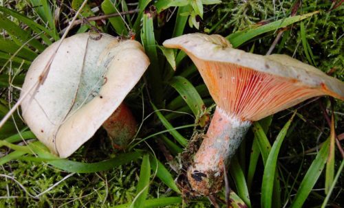 유백색 아종에 속하는 버섯은 침엽수림의 소나무 아래에서 자랍니다. 지름이 최대 9cm에 달하는 육질의 빽빽한 갓을 가지고 있습니다. 갓 가장자리는 약간 아래로 말려 있으며, 중앙에 특징적인 함몰이 있습니다. 원래 색깔은 연한 주황색이지만, 버섯이 성숙함에 따라 가장자리는 분홍빛을 띠고 중앙은 녹색으로 변합니다.