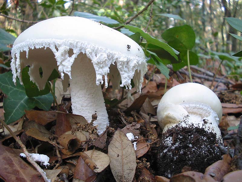| 흰 냄새 나는 파리 독버섯(치명적인 독) | 원뿔형이며 흰색입니다. 가운데가 노르스름한 색조를 띱니다. 표면은 매끄럽고 혹이 없습니다. | 원통형이며 거의 항상 곡선형이고 색상은 흰색입니다. | 흰색이며, 끊어질 때 강한 염소 냄새가 납니다. | 자주 나타나며 회색 또는 흰색입니다. |