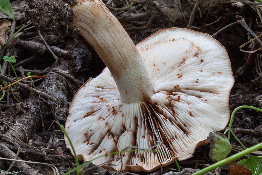 줄기는 다육질이며, 지름 1.5~4cm, 길이 3~8cm입니다. 줄기의 색깔은 시간이 지남에 따라 흰색에서 적갈색으로 변합니다. 누르면 줄기 표면이 어두워집니다.