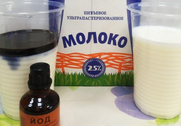 준비하려면 우유 1리터에 요오드 3방울과 세탁 세제 가루를 넣고 녹입니다. 사용 전에 용액을 잘 섞으세요.