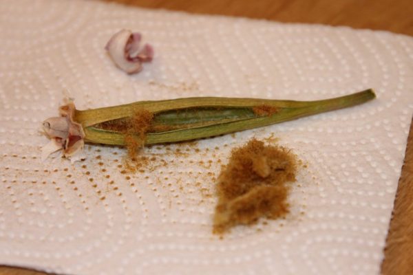 캡슐이 마르면 잘라내고 씨앗 가루를 종이에 뿌립니다. 이렇게 작은 씨앗을 심는 것은 매우 어렵습니다. 이것이 씨앗 번식이 종종 실패하는 또 다른 이유입니다.
