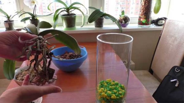 난초용 유리 화병은 햇빛이 뿌리에 닿도록 하여 뿌리 건강에 도움을 줍니다. 하지만 이러한 용기는 통풍이 잘 되지 않기 때문에 숙련된 기술과 경험이 필요합니다. 이는 뿌리에 물을 너무 많이 주어 난초의 건강에 해로울 수 있습니다. 정원사가 유리 화병에 팔레놉시스를 키우기로 결정했다면, 적절한 배수를 제공해야 합니다. 가장 쉬운 방법은 플라스틱 용기에 식물을 심고, 화분을 아무 화병에나 꽂는 것입니다.