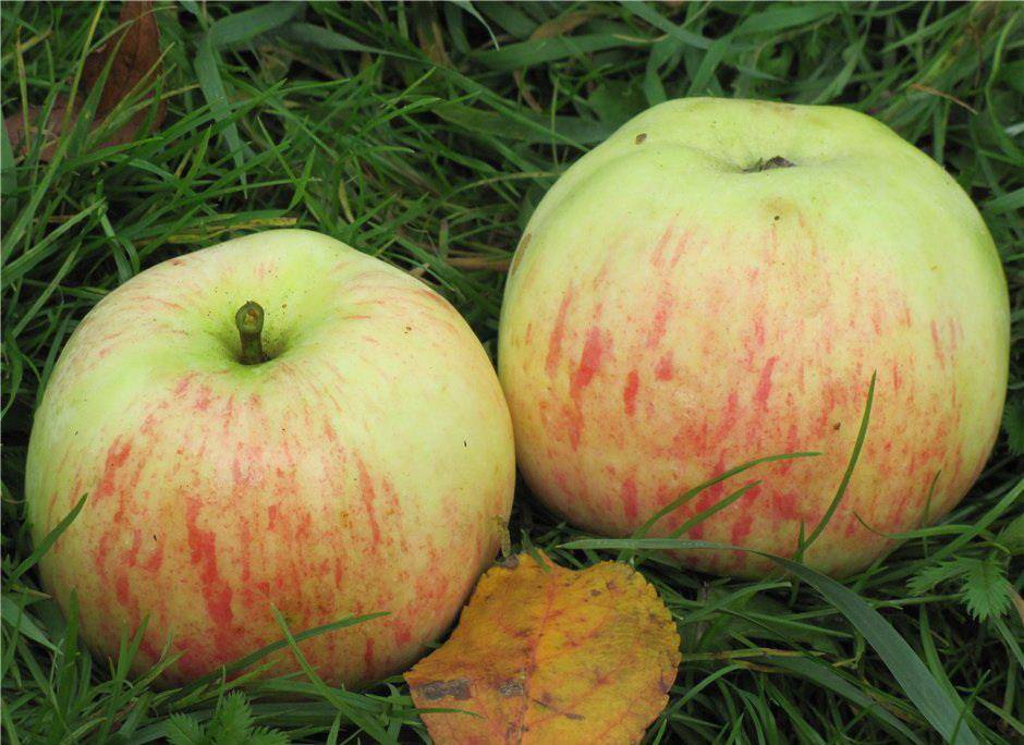 이 식물은 적당한 생장과 드문드문한 잎이 특징입니다. 크고 둥글며 약간 주름진 열매는 무게가 180~280g에 달하며, 연한 노란색을 띱니다. 사과의 연한 노란색 껍질에는 다양한 너비의 붉은 줄무늬와 갈색 반점이 불규칙하게 나타납니다. 속은 단단하고 즙이 많으며, 달콤하고 시큼한 맛이 납니다. 좋은 열매를 맺으려면 수분 매개자가 필요합니다. 특징: