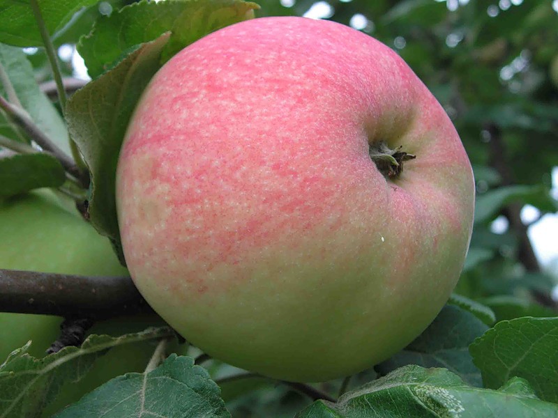 키가 크고 꼭대기가 둥근 이 품종은 몇 개의 튼튼한 목질 싹을 가지고 있습니다. 평균 크기보다 큰 열매는 무게가 225~255g이며, 둥글고 대칭적인 모양과 붉은빛이 도는 윤기 나는 연녹색 껍질이 특징입니다. 껍질은 왁스 같은 코팅을 하고 있습니다. 연노란색 피하 조직은 달콤하면서도 시큼한 디저트 맛과 기분 좋은 향을 가지고 있습니다. 특징: