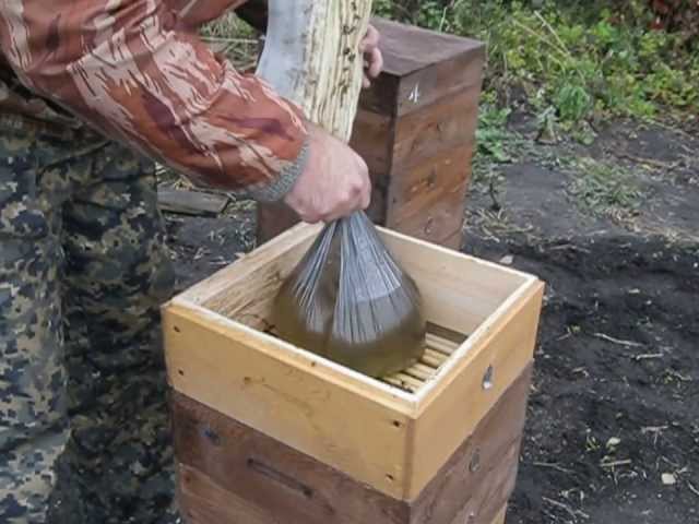 8월에서 9월 사이에 먹이를 줄 때는 걸쭉한 꿀 혼합물을 사용하세요. 꿀 세 그릇에 물 한 그릇을 넣으면 됩니다. 걸쭉해진 꿀은 불 위가 아닌 중탕으로 먼저 녹입니다. 물을 끓인 후 식히고, 재료를 40도에서 섞습니다.