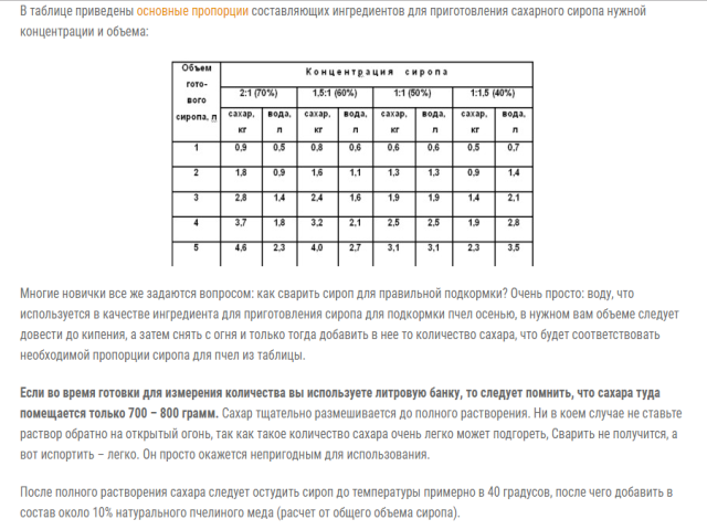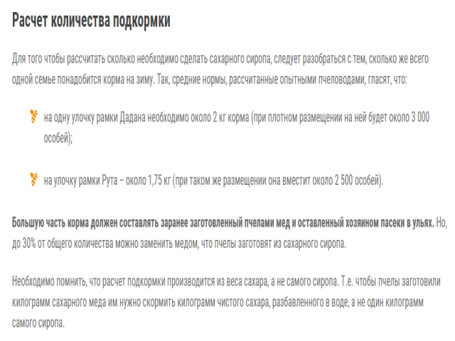 설탕물을 사용할 때는 벌이 얼마나 많은 꿀을 추출할 수 있는지 고려해야 합니다. 영양액의 양을 최종 제품인 가공 꿀과 비교하는 것은 옳지 않습니다. 섭취한 설탕의 양만 고려해야 합니다. 평균적으로 설탕 1kg은 천연물 1kg을 생산합니다. 이 중 4분의 1은 벌이 가공하여 벌집으로 운반하는 데 사용됩니다.