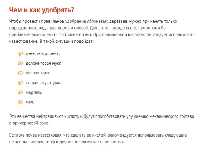 과수에 시비를 하는 것은 산업계에서 기성 비료가 도입되기 훨씬 전부터 행해졌습니다. 농촌 지역에서는 가을에 사과나무에 부식질, 퇴비, 또는 거름을 사용하여 시비를 했습니다. 이러한 시비는 뿌리가 덮고 있는 전체 면적에 시비해야 합니다. 여름철에는 정오 무렵 수관에 의해 형성되는 그림자의 가장자리를 관찰하여 시비를 가장 정확하게 판단할 수 있습니다.