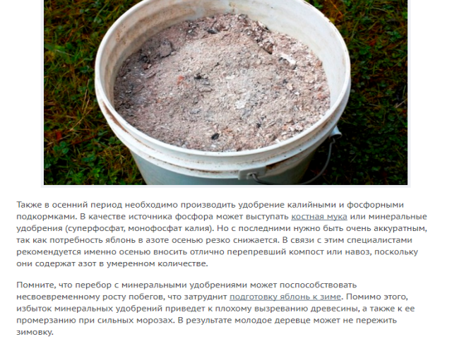 시비량, 종류, 시비 방법을 결정할 때는 나무의 나이, 품종, 뿌리 발달 상태를 고려하는 것이 중요합니다. 가을에 사과나무에 미네랄이 과다 공급되면 새싹이 일찍 자라기 시작하고, 나무껍질의 내한성이 크게 감소하여 나무가 얼어붙을 수 있습니다.