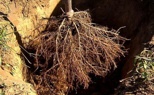 뿌리가 노출된 과일나무의 경우, 뿌리 자극제를 24시간 동안 처리합니다. 준비된 구덩이에 물을 충분히 줍니다. 깨끗한 도구를 사용하여 묘목의 뿌리를 25cm 길이로 다듬습니다. 소독을 위해 노출된 부분에 분쇄 활성탄을 뿌립니다. 구덩이에 묘목을 원하는 높이로 놓을 수 있도록 흙더미를 만듭니다. 묘목을 흙더미 위에 말뚝 남쪽을 향하게 놓고 뿌리를 펴줍니다.