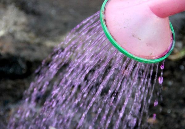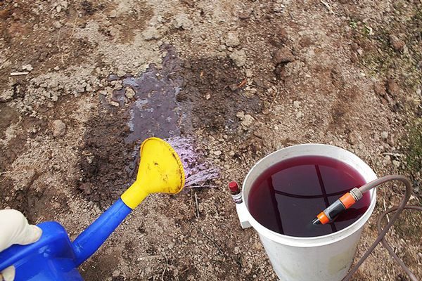 비료를 주려면 물 한 통에 과망간산칼륨 3~5g을 섞어 용액을 만드세요. 물을 주기 전에 흙을 적신 후 물뿌리개에 있는 용액을 뿌리세요. 뿌리에서 6cm 떨어진 곳에 용액을 뿌리세요. 1m 동안2 용액 소모량은 5리터가 되어야 합니다.