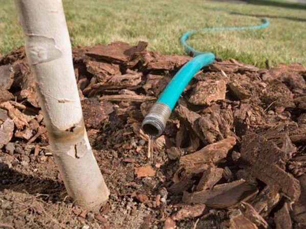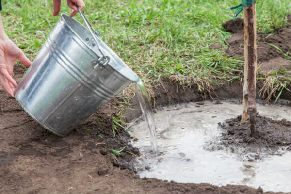 나무 주위에 작은 구멍을 파고 물을 붓습니다. 구덩이가 완성되면 흙으로 채웁니다. 넓은 면적과 큰 나무에는 호스를 사용하는 것이 좋습니다.