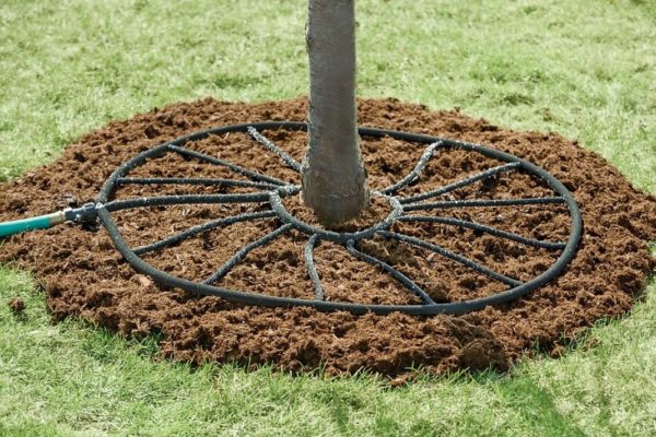 특수 관개 시스템이 없는 경우 가능합니다. 호스를 사용하다구멍이 뚫려 있습니다. 이 구멍은 물 공급 장치에 연결되거나 주 호스에 연결되어 몸통 주위에 놓입니다. - 지하 – 뿌리가 거의 표면에 위치할 때 사용합니다.