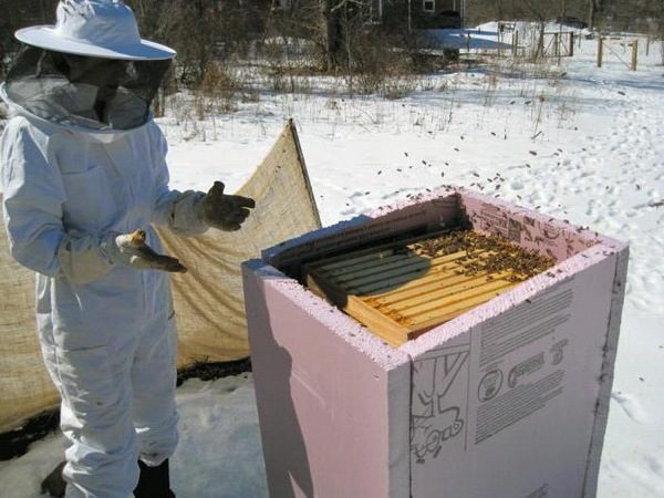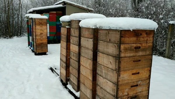 - 실외. 가장 중요한 요건은 빽빽한 눈 덮개입니다. 이는 서리로부터 추가적인 보호를 제공합니다. 이 경우에도 벌통은 삼베나 폼으로 단열 처리하고, 지지대에 고정한 후, 눈이 벽에 닿지 않도록 벌통 주변을 파냅니다. 통풍을 위해 뚜껑 아래에 구멍을 뚫습니다. 구멍은 비나 해빙으로 녹은 눈이 들어오지 않도록 설치해야 합니다.