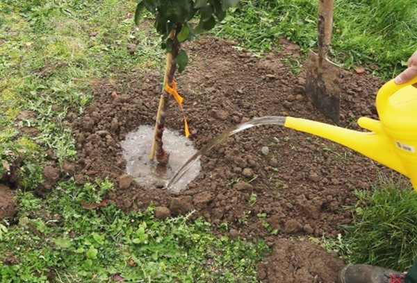 - 사과나무 주변의 흙에 과망간산칼륨의 분홍색 용액을 뿌려 물을 줍니다.
