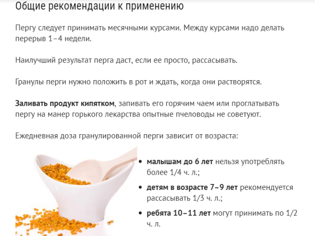 최대의 효과를 얻으려면 정식 식사 30분 전에 섭취해야 합니다. 그 후 최소 2시간 동안은 음식이나 음료를 섭취하지 않는 것이 좋습니다. 전문가들은 벌빵을 질병 예방 및 치료에 여러 차례, 일반적으로 한 달을 넘지 않는 기간 동안 복용해야 한다고 주장합니다.