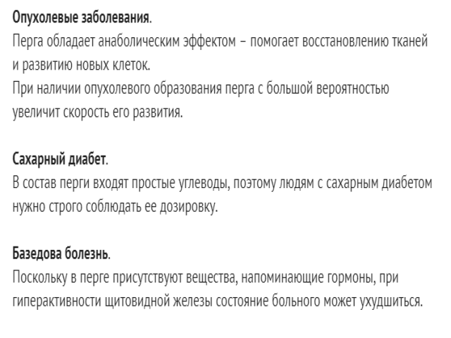 페르가는 식욕을 증가시키므로 다이어트 중이라면 이 벌 제품을 섭취해서는 안 됩니다. 지방이 많은 음식에 대한 강한 갈망을 유발할 수 있습니다.