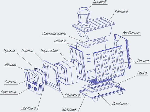 스토브는 다양한 디자인을 가지고 있으며, 장인은 항상 사우나의 구조를 고려하여 여러 개의 투사도를 사용하여 맞춤 설계도를 제작합니다. 그녀의 모델은 폐쇄형과 개방형, 두 가지 유형의 스토브 디자인을 제시합니다.