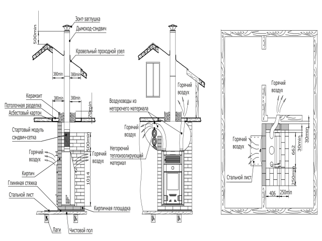 건물 지붕에는 연기 배출관을 위한 구멍을 미리 뚫어야 합니다. 따라서 난로 설계, 특히 독립적으로 제작하는 난로 설계는 목욕탕 설계와 동시에 고려해야 합니다.