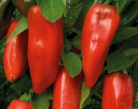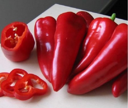 이 품종은 완전히 자라는 데 90일이 걸립니다. 덤불은 높이 60cm에 달하며 반쯤 퍼집니다. 열매는 중간 크기로 무게는 최대 120g입니다. 작고 길쭉한 고추는 익으면서 녹색에서 빨간색으로 변합니다.