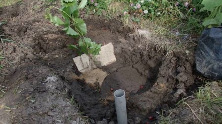 구덩이의 크기는 포도나무의 성숙도에 따라 달라집니다. 비교적 어리고 뿌리가 너무 멀리 퍼지지 않았다면 구덩이 깊이는 50~60cm가 될 수 있습니다. 다 자란 포도나무는 100cm 깊이의 구덩이에 심습니다. 구덩이의 깊이는 토양 성분에도 따라 달라집니다. 토양이 부드럽고 비옥하면 뿌리가 빠르게 수직으로 자랍니다. 밀도가 높은 토양에서는 뿌리가 자라기 어려우므로 구덩이를 더 크게 파서 자랄 공간을 확보하는 것이 좋습니다. 또한, 점토질 토양에서는 배수층이 필수적입니다.