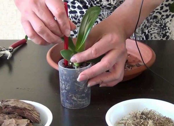 미니 난초를 흙에 단단히 고정하기 위해 분갈이하는 것은 어렵습니다. 처음 며칠 동안은 옆으로 기울어질 수 있습니다. 이 경우, 부드러운 끈이나 끈으로 줄기를 화분 가장자리에 묶어주세요. 이 끈은 최소 2~3개월 후에 제거해야 합니다.