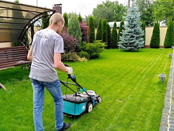 - 잔디 깎는 기계. 기계식 또는 전기식 잔디 깎는 기계로, 날이 달린 드럼이 있습니다. 넓은 면적에는 전기식 또는 무선 잔디 깎는 기계가 적합합니다. 좁은 면적에는 수동 잔디 깎는 기계가 효과적입니다.