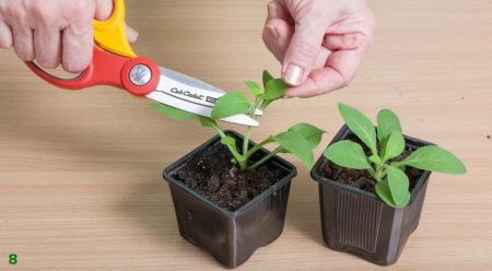 싹을 뽑아내는 작업은 송곳을 사용하여 진행하는데, 송곳은 페튜니아 덤불을 들어 올려 뿌리의 흙과 함께 조심스럽게 새 위치로 옮겨 심는 데 사용됩니다. 묘목을 자엽까지 밀어내립니다(자엽은 표면 위로 나와 있어야 합니다).