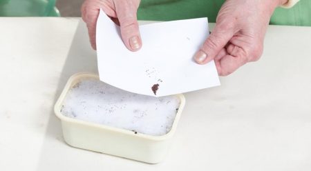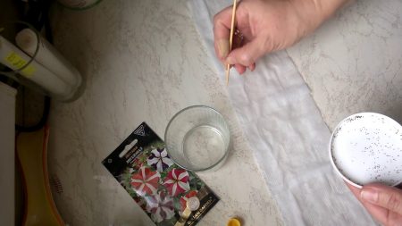 - 씨앗은 젖은 종이 표면의 스트립 한쪽 가장자리에 서로 4cm 떨어진 곳에 놓입니다.