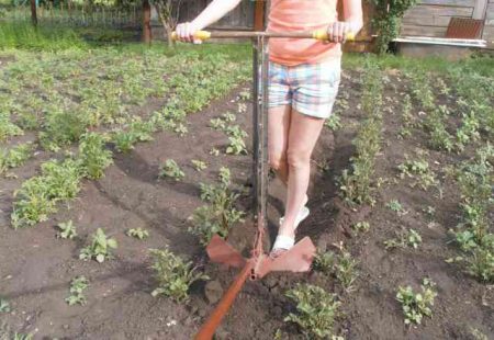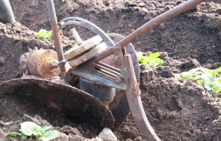 수동 힐러의 작동 원리는 매우 간단합니다. 두 사람이 도구의 앞뒤를 잡습니다. 앞쪽에 있는 사람은 손잡이에 기대어 도구를 앞으로 밀어냅니다. 뒤쪽에 있는 사람은 손잡이를 사용하여 원반을 땅에 밉니다.