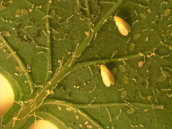 이 곤충들은 오이 수액을 빨아먹습니다. 수액을 빨아먹기 위해 잎 표면을 뚫습니다. 이로 인해 손상된 부위에 밝은 반점이 생깁니다. 잎은 점차 말라 죽습니다. 흰파리는 수액을 빨아먹는 동안 감염을 촉진하는 당분을 분비합니다.