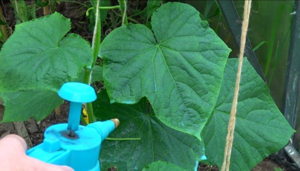 오이 자엽이 싹을 틔운 후 색이 옅어졌다면 "젯(Jet)"으로 처리하십시오. 이 제품은 분말 형태로 시중에서 구입할 수 있습니다. 사용 전에 설명서에 따라 물 10리터당 100g의 비율로 물에 희석하십시오. 보관 중 효능이 떨어지므로 즉시 사용하십시오. 수확 전까지 한 달에 두 번 정도 분무하십시오.