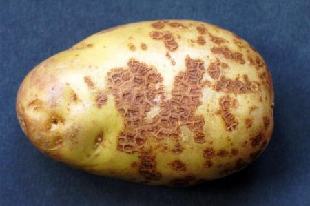 건강한 감자의 껍질은 매끄럽고 얇습니다. 특정 부위가 어두워지고 두꺼워지고 딱딱해지거나 감자 전체에 갈라지고 딱지가 생기면 위험한 딱지병에 감염된 것입니다. 때로는 감염된 덩이줄기 전체가 짙은 딱지병 반점으로 뒤덮이기도 합니다. 감자의 과육이 썩기 시작합니다. 줄기에 갈색 반점이 생기고 잎은 말리고 어두워지며 말라 죽습니다.