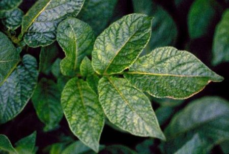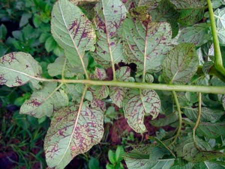 싹이 트는 시기에는 윗잎 가장자리가 물결 모양으로 솟아오릅니다. 덤불의 윗부분은 숟가락이나 꽃봉오리처럼 보입니다. 일반적으로 생장기가 끝날 무렵에는 잎이 곧게 펴지지만, 열매는 이미 손상된 상태입니다. 덩이줄기는 많은 양의 전분을 잃고 풍미도 떨어지며, 수확량은 적습니다. 때로는 수확량의 최대 40%까지 손실될 수 있습니다.