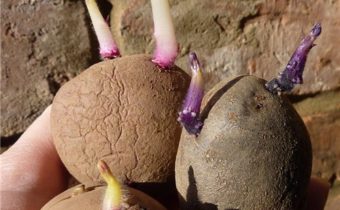 할 수 있다 감자를 펼쳐 놓다 방은 너무 따뜻해서는 안 됩니다. 섭씨 14도 정도면 충분합니다. 하지만 한 달 내내 일광은 꾸준히 공급되어야 합니다. 햇빛은 덩이줄기에 영향을 미쳐 짙은 녹색 새싹이 돋아나며, 자줏빛을 띠기도 합니다. 새싹이 2cm 이상 자라지 않도록 주의해야 합니다.