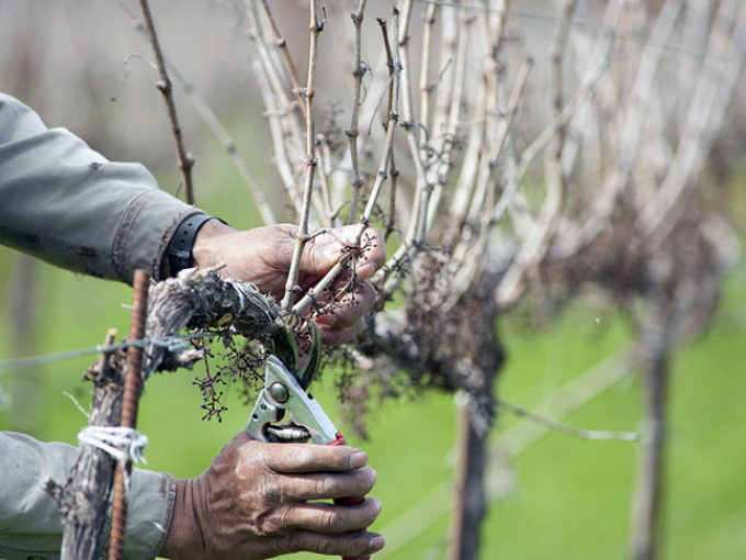 가지치기의 마지막 단계는 충분한 빛과 통풍을 방해하는 과도한 새순을 다듬는 것입니다. 포도나무의 예비 새순 중 최소 30%는 포도나무에 남겨 두어야 합니다. 이는 서리나 설치류의 주요 가지 피해에 대비하기 위한 것입니다. 어린 새순은 겨울 동안 시들어 봄에 추가적인 감염원이 될 수 있으므로 제거해야 합니다.