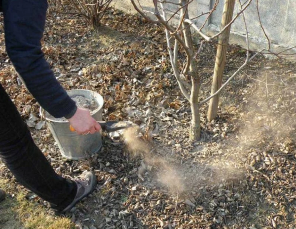 - 액체 혼합물을 나무 주변에 파낸 홈에 넣습니다. 홈은 성숙한 나무 근처에는 30cm 깊이로, 3~7년생 어린 나무 근처에는 15~20cm 깊이로 파냅니다. 용액을 홈에 붓고 흙으로 덮습니다.